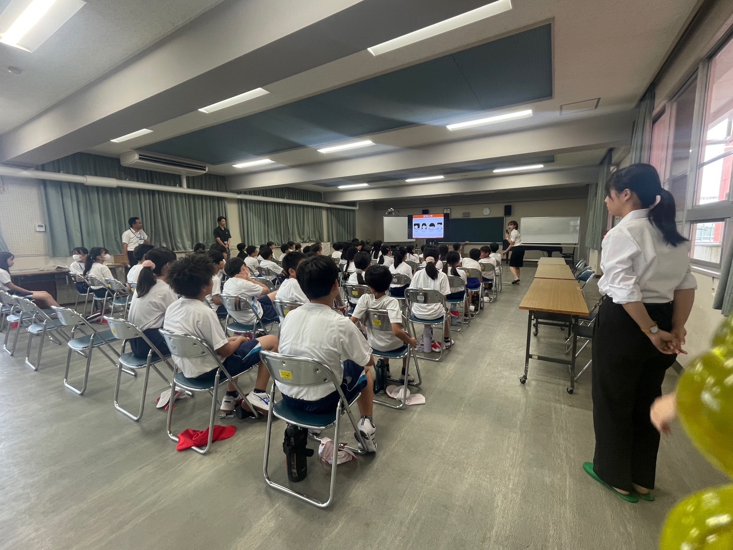 ●スポーツ専門員である、郷亜里砂選手、楠原千秋選手、嶋田亨選手、出口諒財選手の4人をお招きし、講和やスポーツ体験を行いました。講和では、プロジェクターを使用し、海外での試合風景やオリンピックの写真を見せていただきながらエピソードを紹介してくださいました。子どもたちもトップアスリートのお話を熱心に聞いていました。